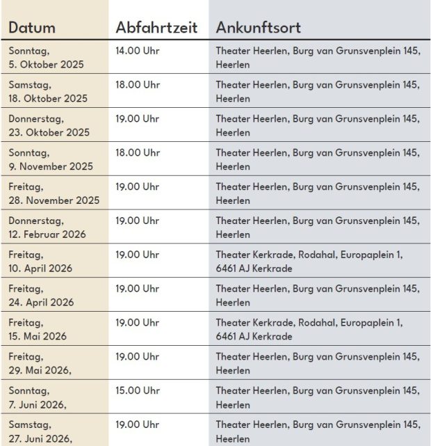 Zu allen Konzerten gibt es einen kostenlosen begleitende Bustransfer vom Eurogress Aachen nach Heerlen bzw. Kerkrade und zurück an. Bei Abonnements bitte angeben, für welche Termine Sie den Transfer nutzen möchten. Die Bus finden Sie an der Bushaltestelle „Eurogress“ beim Hotel Quellenhof, Monheimsallee. Ein Busbegleiter is dabei.