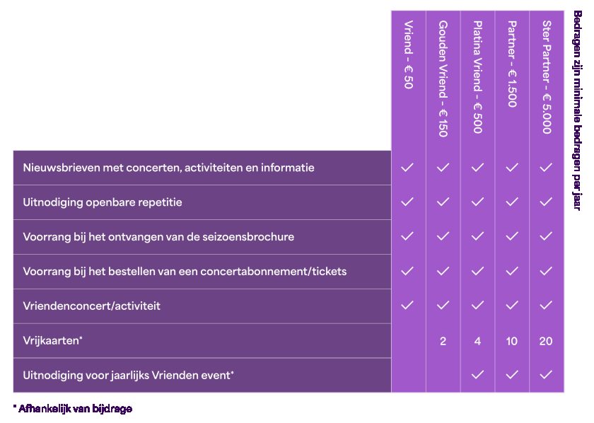De Partners geven het orkest extra ruimte om dat ene concert nog bijzonderder te maken en samen te werken met topdirigenten en beroemde solisten. Hiermee dragen de Partners bij aan de artistieke ontwikkeling en ambities van het orkest en maken de Partners het mogelijk dat ons publiek in de eigen concertzaal naar topmusici kan luisteren.